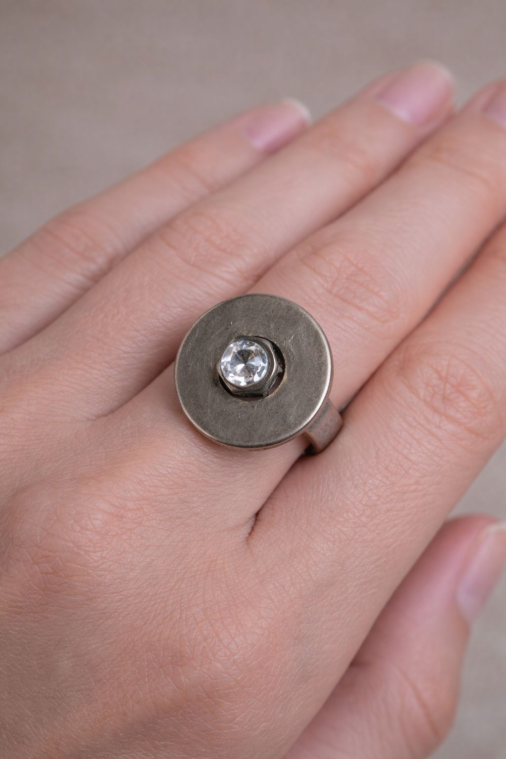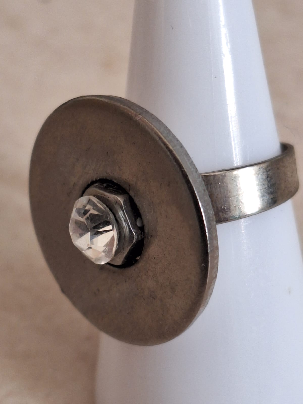 טבעת בעיצוב תעשייתי מפלדת אל-חלד עם קריסטל לבן שקוף של סוורובסקי. הקריסטל מוצמד לאום נירוסטה שממוקם בתוך החור של שייבה  מנירוסטה.