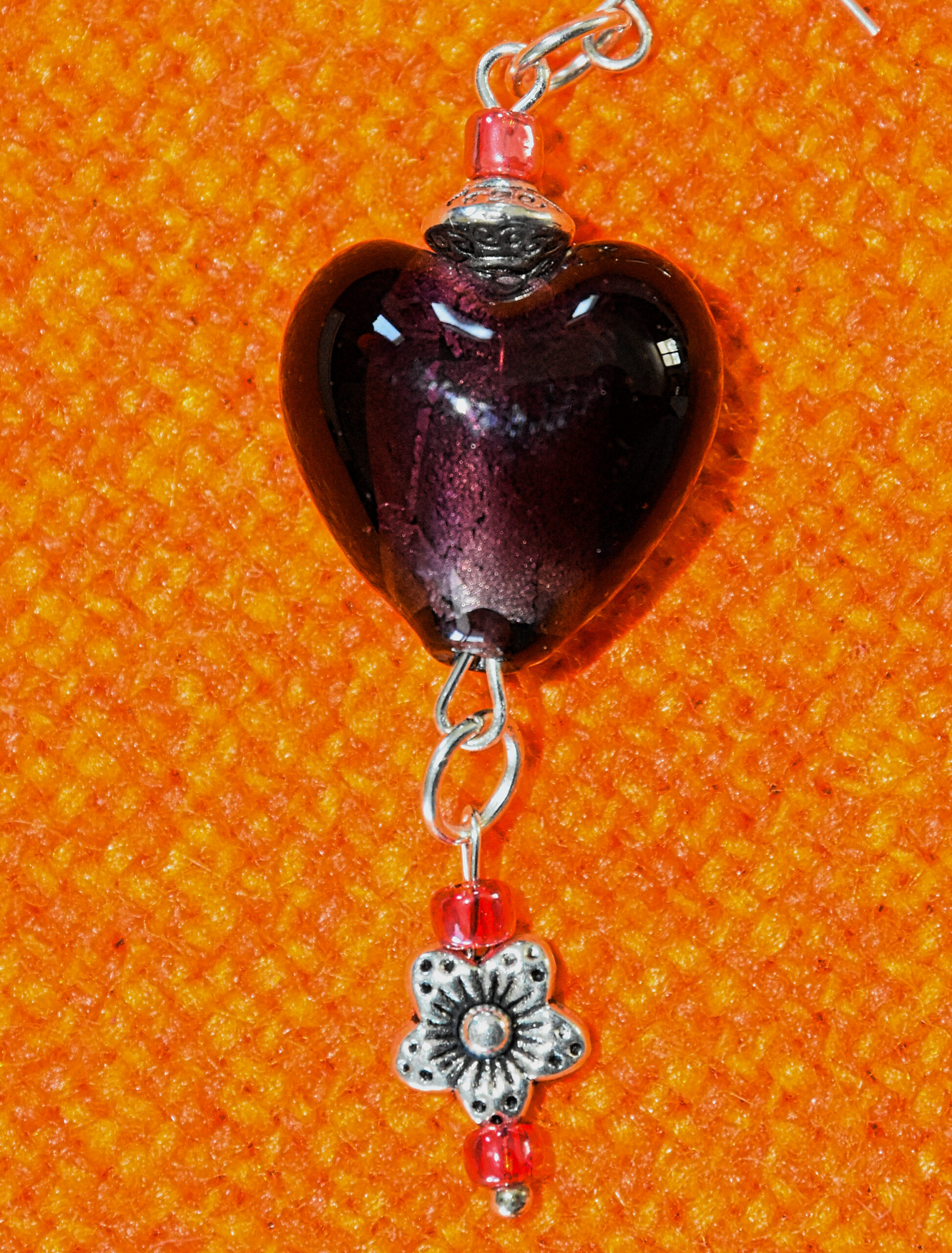 עגילים מקסימים בצבע סגול בצורת לב. הם עשויים מזכוכית מורנו ובתוכם ישנו לוח כסף קטן שרואים כשהאור משתקף בהם. ווי העגילים עשויים מפלדת אל-חלד.  מלמטה נמצאי 2 חרוזי זכוכית אדומה-בגולה וביניהם חרוז כסף בצורת פרחץ  למעלה, מתחת לוו התליה, נמצא גם כן חרוז זכוכית זהה שמונח על חרוז כסף בצורת עדש.