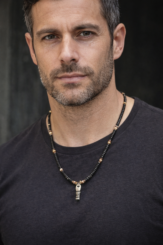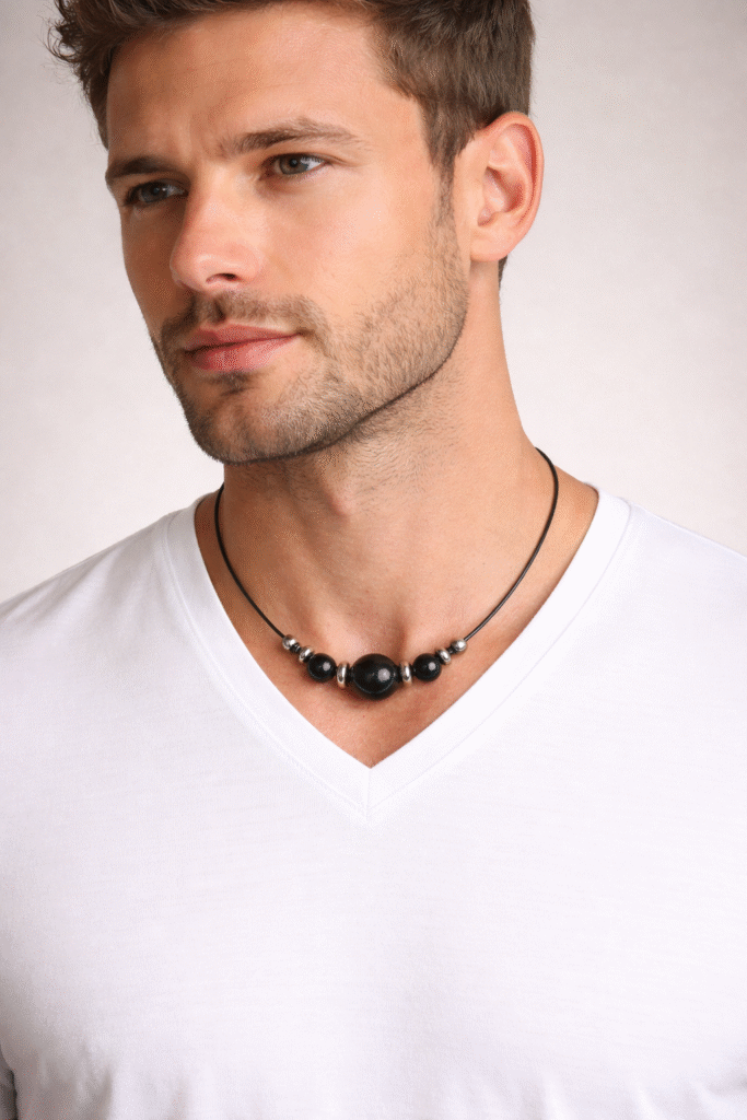 משני צדי השייבה מושחלים חרוזי מתכת אל-חלד, חרוזי אוניקס שחור ואומים שחורים, היוצרים מראה נקי, מודרני ובעל נוכחות.