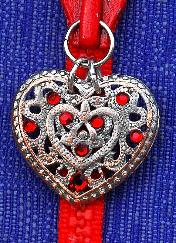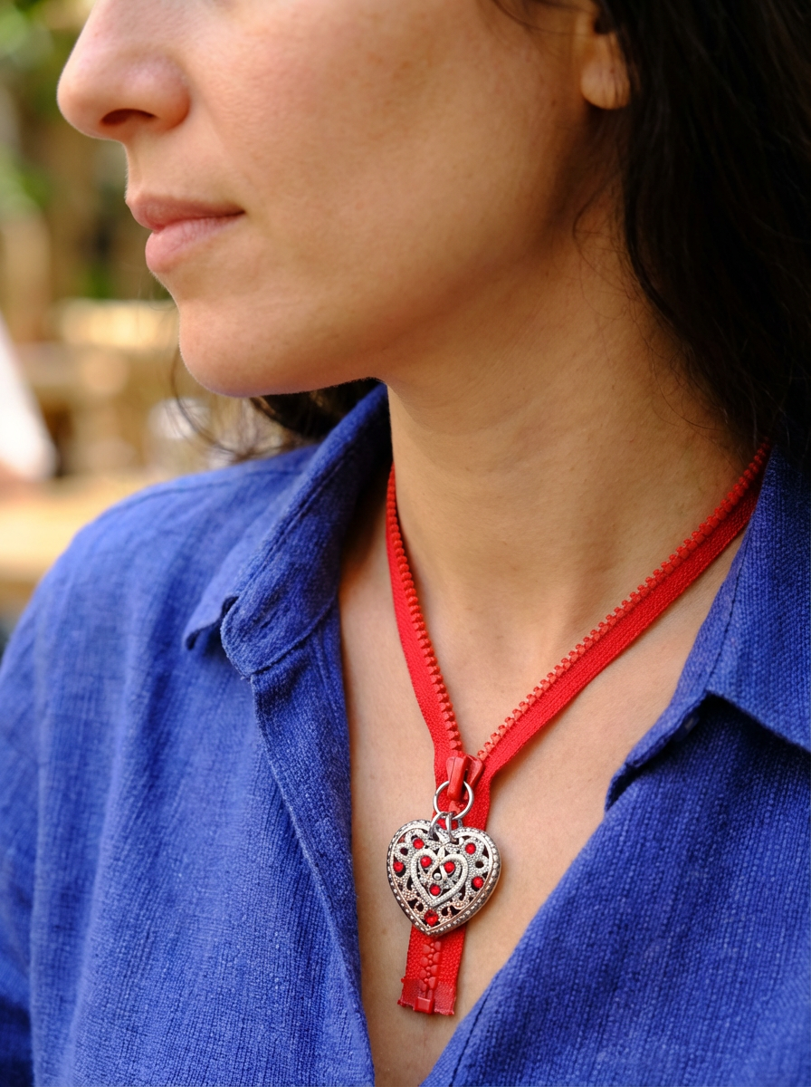 שרשרת קלאסית מרוכסן אדום (חדש) עם שיניים עבות מפלסטיק. הרוכסן באורך 50 ס"מ וניתן למשוך אותו למעלה ולמטה לפי הצורך ולמצב הרוח. הקצה התחתון של הרוכסן מחובר יחד, כך שהוא לא יכול להיפתח. תליון לב כסוף מחובר למחוון על טבעת נירוסטה. לתליון הלב דוגמה יפה מאוד ועליו 8 קריסטלי סברובסקי אדומים.