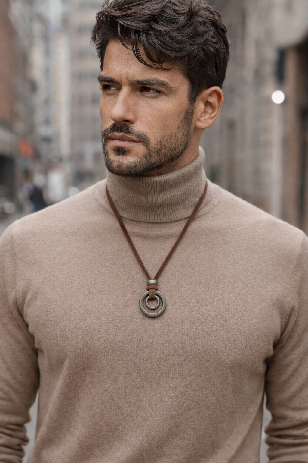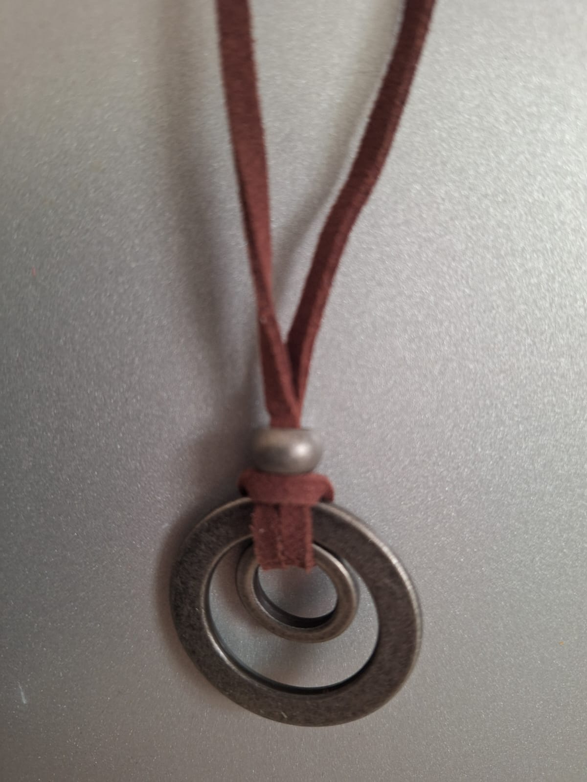 שרשרת עור חומה שטוחה לגבר או לאשה. לשרשרת תיליון 2 טבעות בגדלים שונים ממתכת אל-חלד בצבע אפור כהה. הטבעות נמצאות אחת בתוך השניה ותליות עם קשר לולאה פשוט. מעל לקשר נמצא חרוז מתכת באותו הצבע.