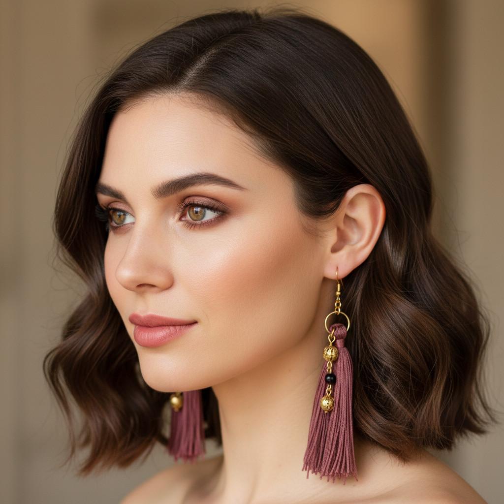 עגילי גדילים בוהמיים ממשי, תכשיט אופנתי למסיבות ולשימוש יום-יומי. 2 חרוזי פליז זהובים וחרוז אבן שחורה אוניקס מוסיפים חן מיוחד לעגיל. ווי תלייה מפליז. אורך כולל של העגיל 7 ס"מ.