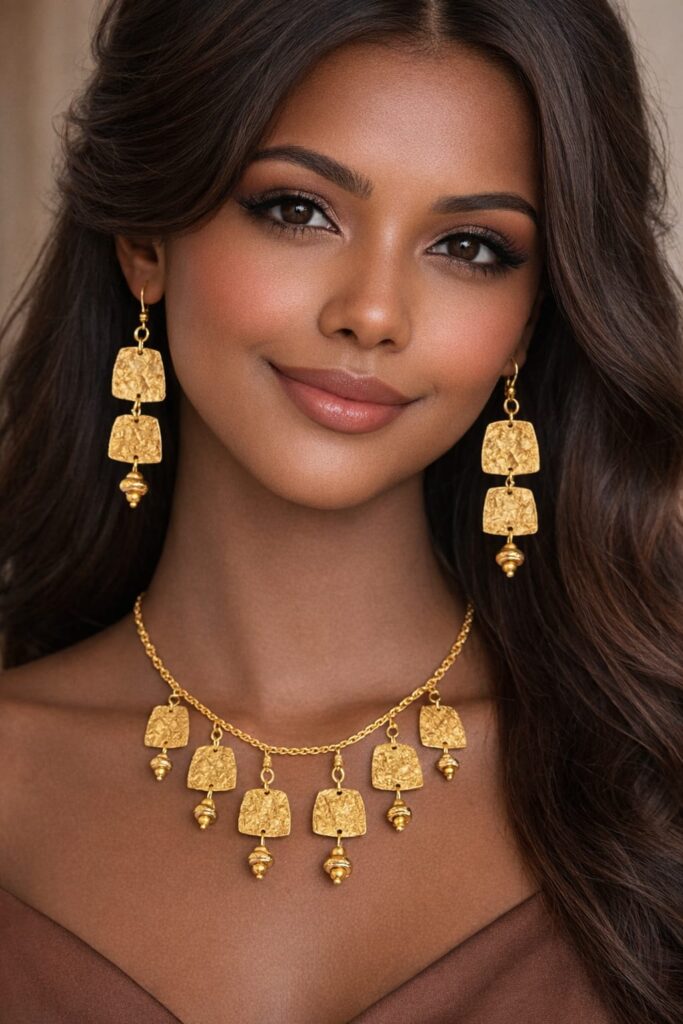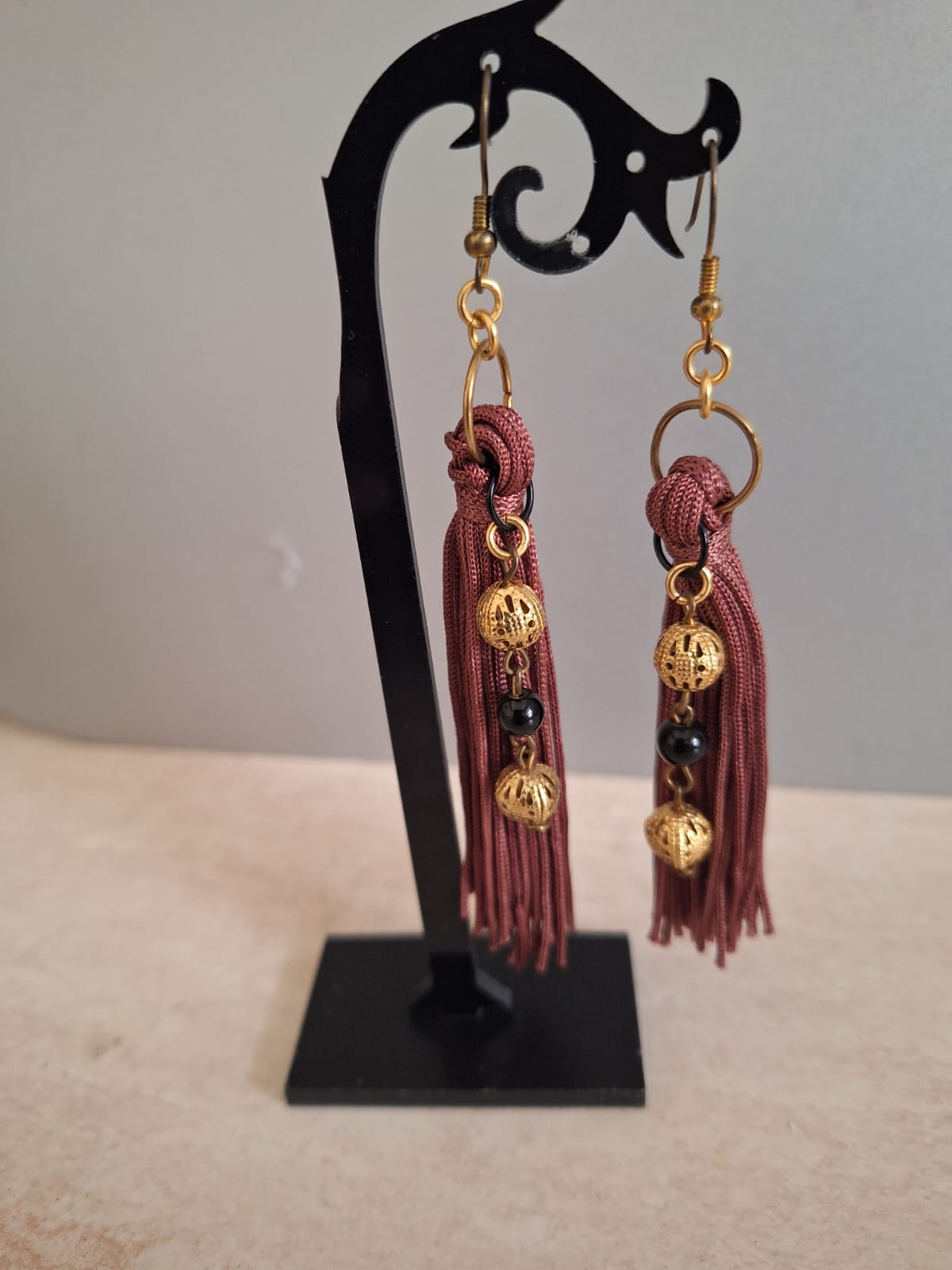 עגילי גדילים חומים עם חרוזים זהובים E 1399